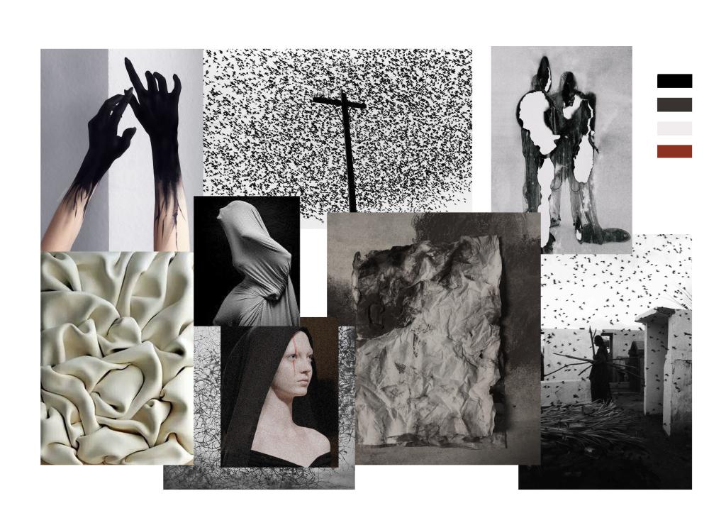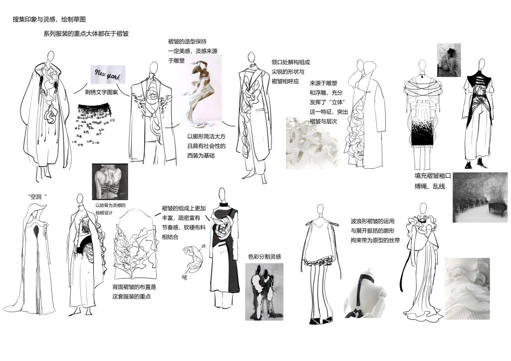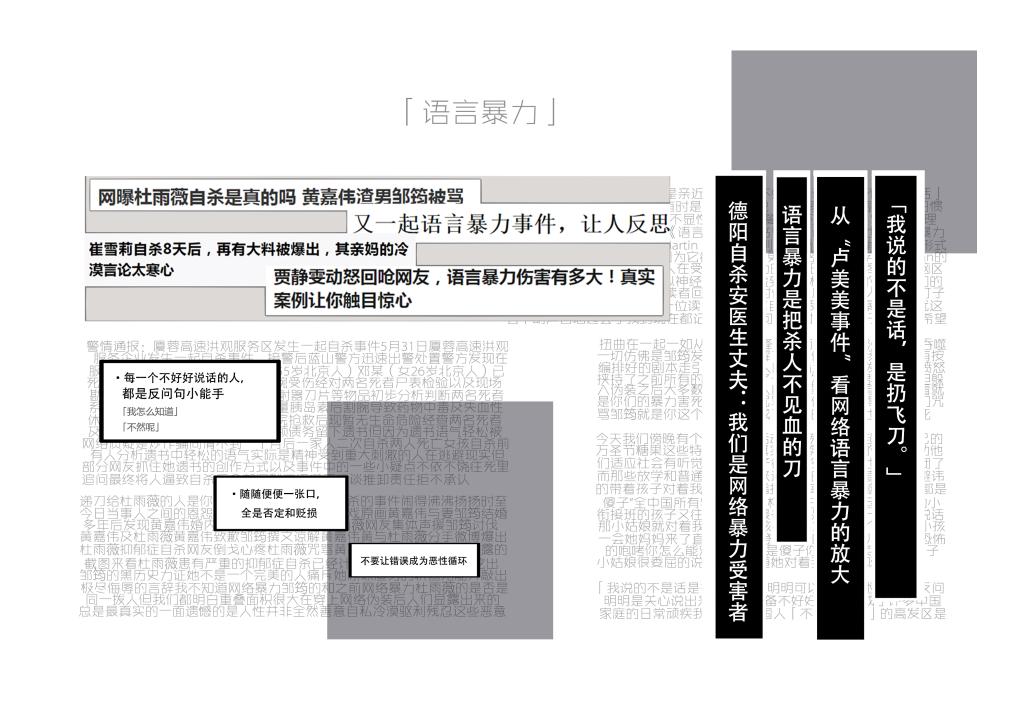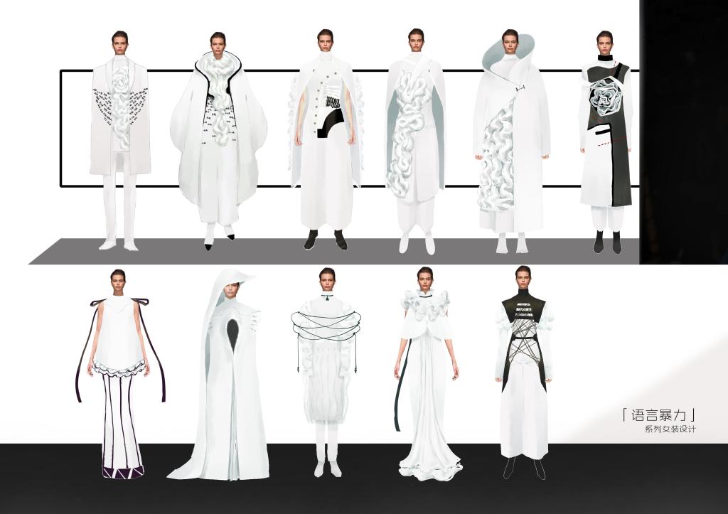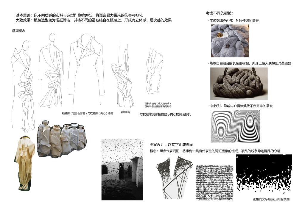 作品简介:本系列作品以隐喻手法,使用代表攻击性语言的硬布料与代表受害者内心的软布料相冲突结合,硬挺的基本廓形相辅以柔软的褶皱,灵活运用褶皱的多样性与组合变化,展现出“受害者遭受暴力后痛苦扭曲的内心状态”,以及文字图案的组合,将语言暴力对他人内心带来的的伤害可视化于服装,呼吁人们共情他人,杜绝语言暴力。