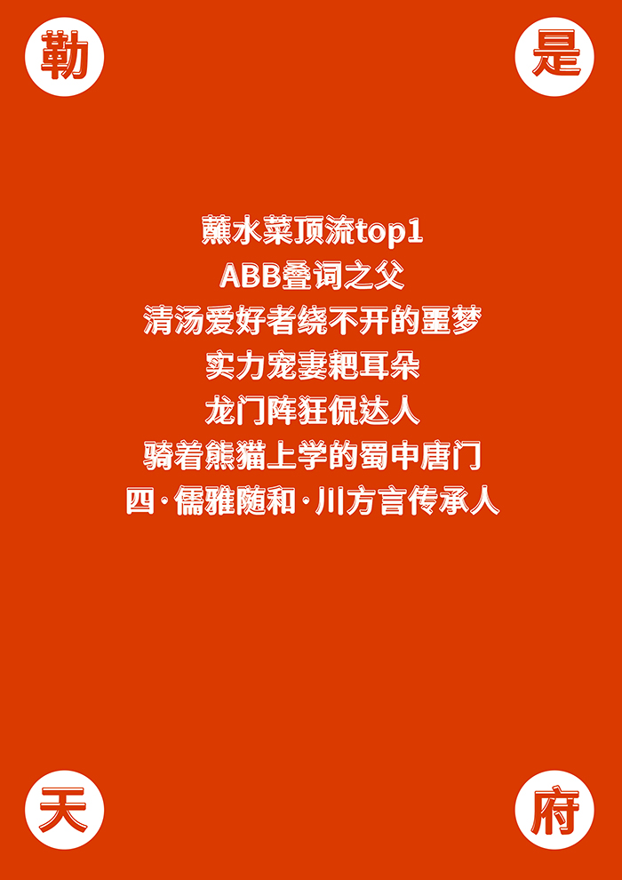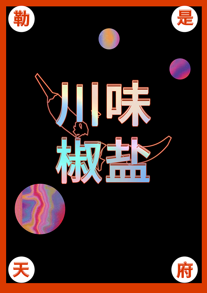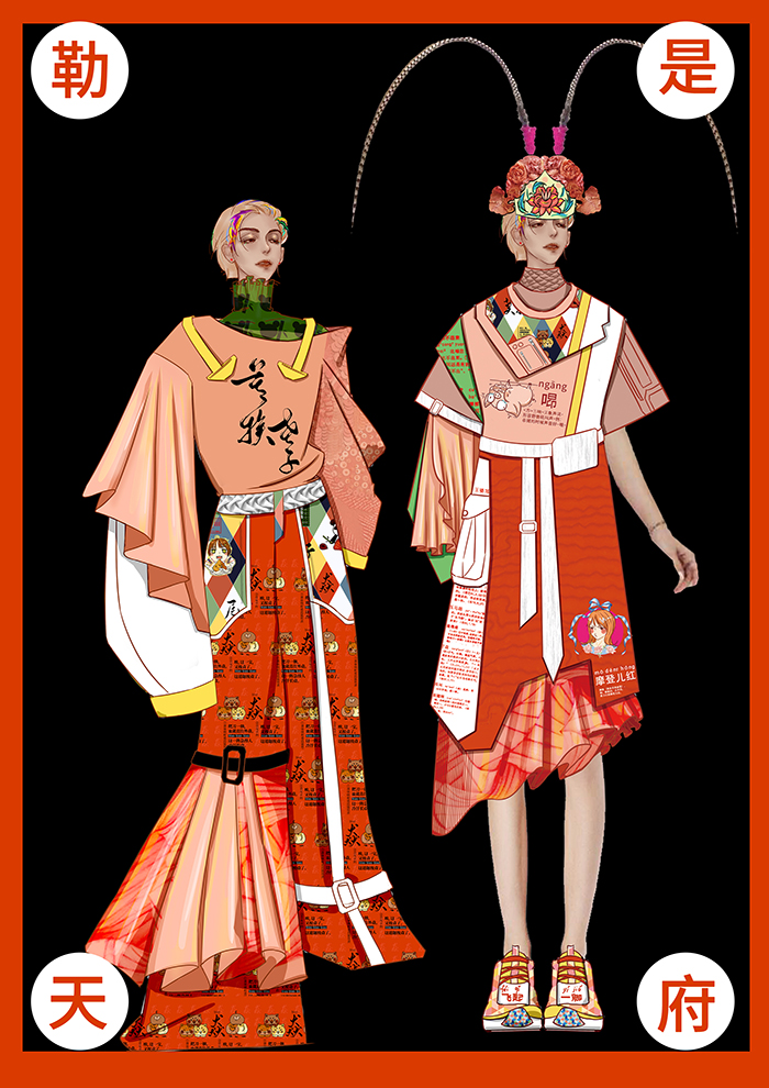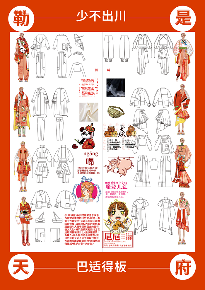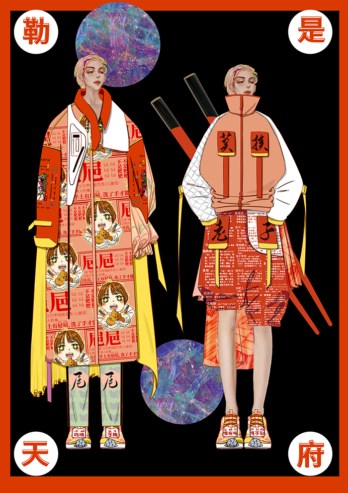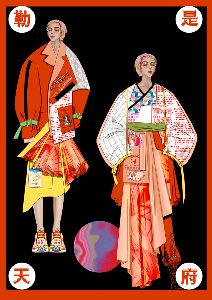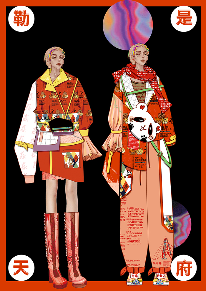 作品简介:《川味椒盐》系列灵感来源于汉语西南官话中的四川方言,视觉上着重于方言文字、音调与图案元素的结合诠释,以有趣和大胆的配色表现出四川人骨子里所蕴含的独特侠义文化。将风趣搞笑的四川方言运用到服装设计上,是以服装设计为媒介,向外界传达设计理念,其目的是为了让人们了解现代社会方言的艰难处境,保护乡音中的乡愁。