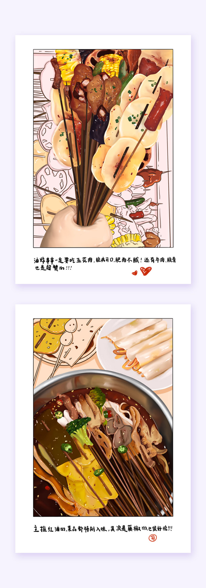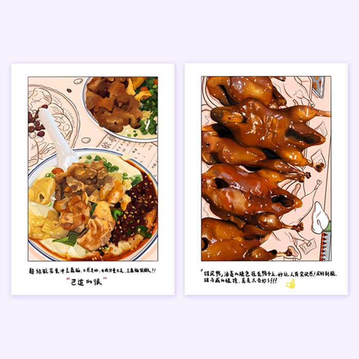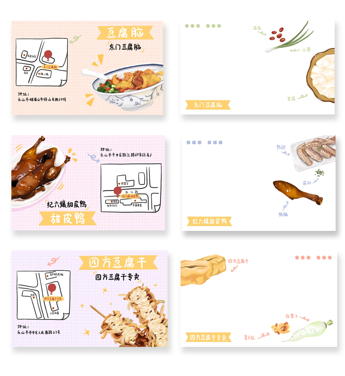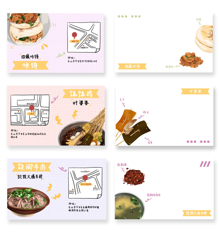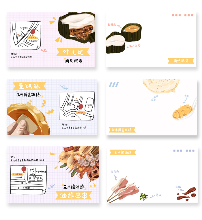 作品简介:随着乐山旅游业的不断发展,乐山美食被越来越多的人所熟知,同时一些网红店铺也开始崛起,“淹没”了属于乐山味道的店铺,也秉着对家乡美食的喜爱,在此基础上,以乐山美食为主题进行插画设计,在推广乐山美食的同时,带大家去探寻一些隐匿的美食小店;除此之外还设计了相对应的明信片。